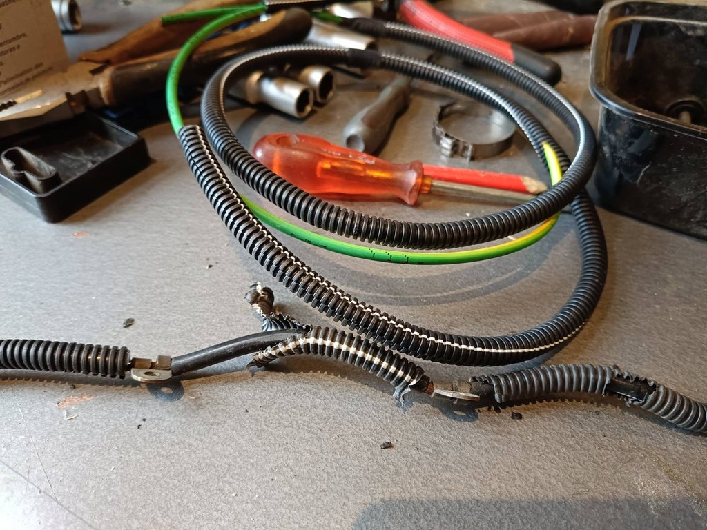 К счастью, в моих запасах нашелся оригинальный ситроеновский массовый провод в точно такой же гофре. Из неё я вырезал куски нужной длины и таким образом, решил вопрос. Готовый провод сфотографировать забыл)
