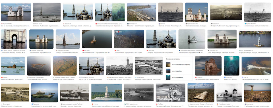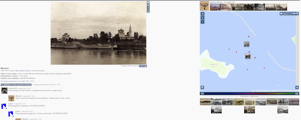 но увидите огромное количество фото, разрушенных, затопленных зданий, который на самом деле нет там, они есть, но не там)))) Изза этого было очень интересно посетить это мистическое место, плюс, было очень интересно посетить саму реку Молога, она втекает в Рыбинское водохранилище. Я стал изучать карту Рыбинки. На ней поиск ничего особо не дал Я наткнулся на один сайт, где были собраны старые фото, 19 века, и ранее, с отметкой геолокации