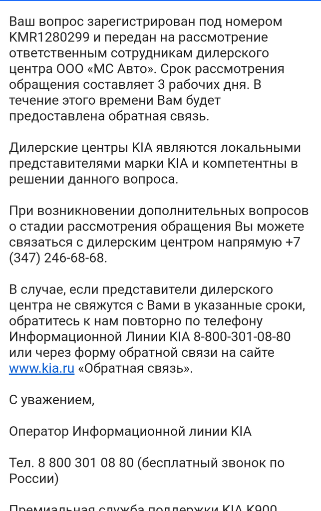 Очень спешил в этот день, не смог обсудить работы с руководством дилера. Но это предстоит, по меньшей мере на сайт дилера, горячую линию КИА и в отзовик, который дилер читает и отвечает – я уже написал. Далее будет книга жалоб и предложений, а далее посмотрим. По реакции ОД.