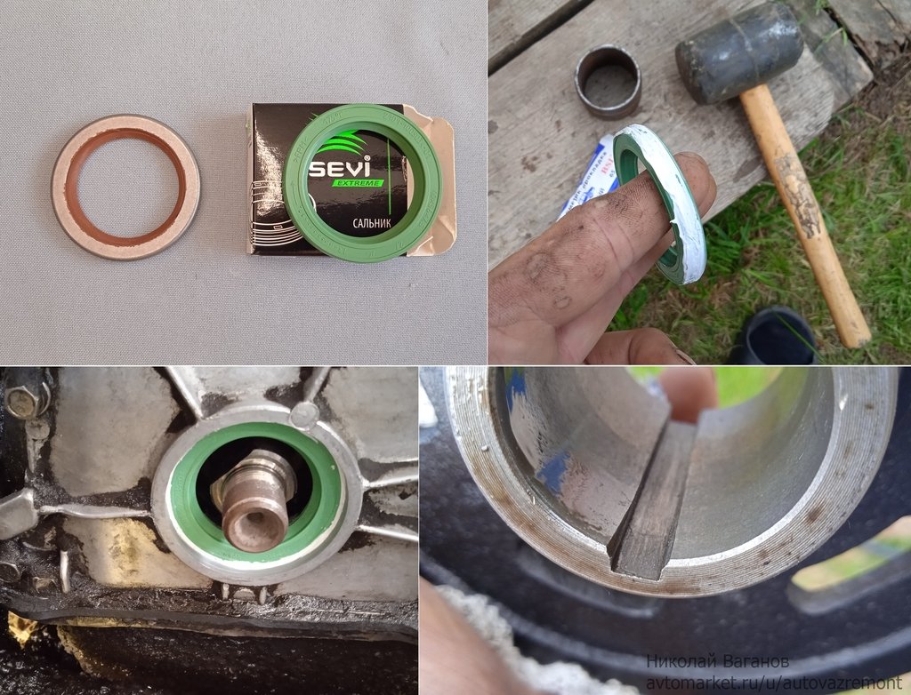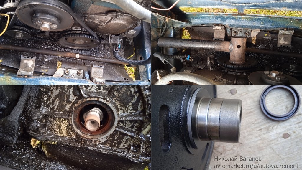 Сорвал гайку шкива коленвала стартером, снял шкив — на нем уже бороздка от сальника, плюс подразбило почему-то выточку под шпонку.