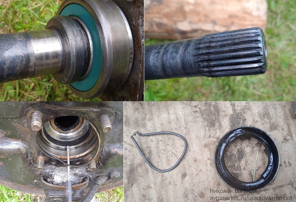 Судя по отметинам на запорной втулке, подшипник уже меняли, никаких люфтов у него не заметил. Шлицевое еще в нормальном состоянии, хоть и виден износ, с сальником пришлось помучаться, так как сьемника не было, но кое-как длинной отверткой удалось его выковырять. Почему-то металическая обойма в одном месте была смята, хотя при вытаскивании полуоси такого бы не получилось, возможно накосячили при его прошлой замене.