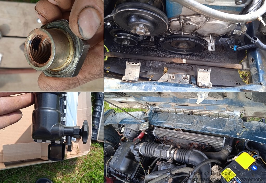 На резьбу гайки перед закручиванием капнул среднего анаэробного фиксатора. На новый радиатор вместо родной пробки поставил краник со сливом, а то не очень удобно сливать — половина мимо уходит.