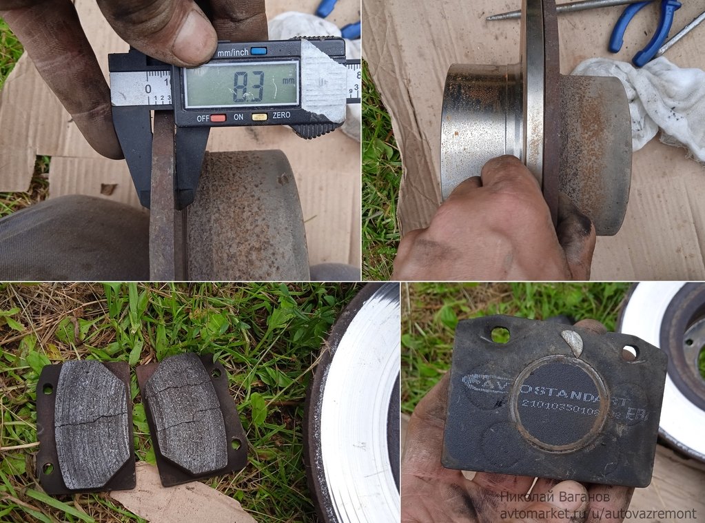 Диски износились до примерно 8-9 мм, тогда как по книге их надо менять уже при 9 мм, также справа их так прилично сожрало дешевыми колодками Автостандарт, установленными на время до замены тормозов, чтобы не ставить новые на старые диски.